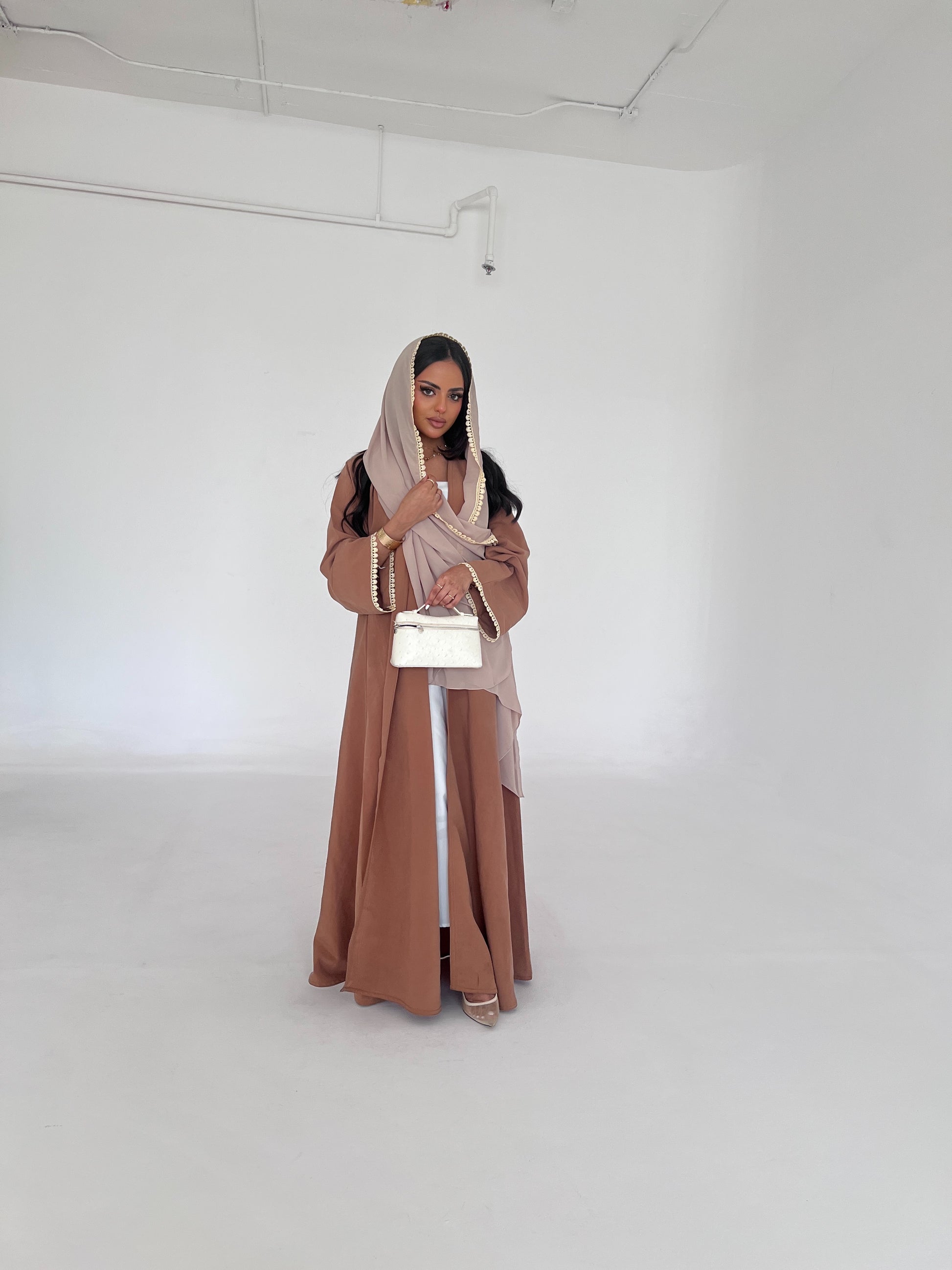 تألّقي بإطلالة راقية مع هذه العباية الفاخرة المصنوعة من الحرير المغسول، الذي يتميز بملمسه الناعم وانسيابيته الراقية. يضفي اللون البني الدافئ لمسة من الأناقة والفخامة، مما يجعلها خيارًا مثالياً لمختلف المناسبات، سواء كانت نهارية أو مسائية.
