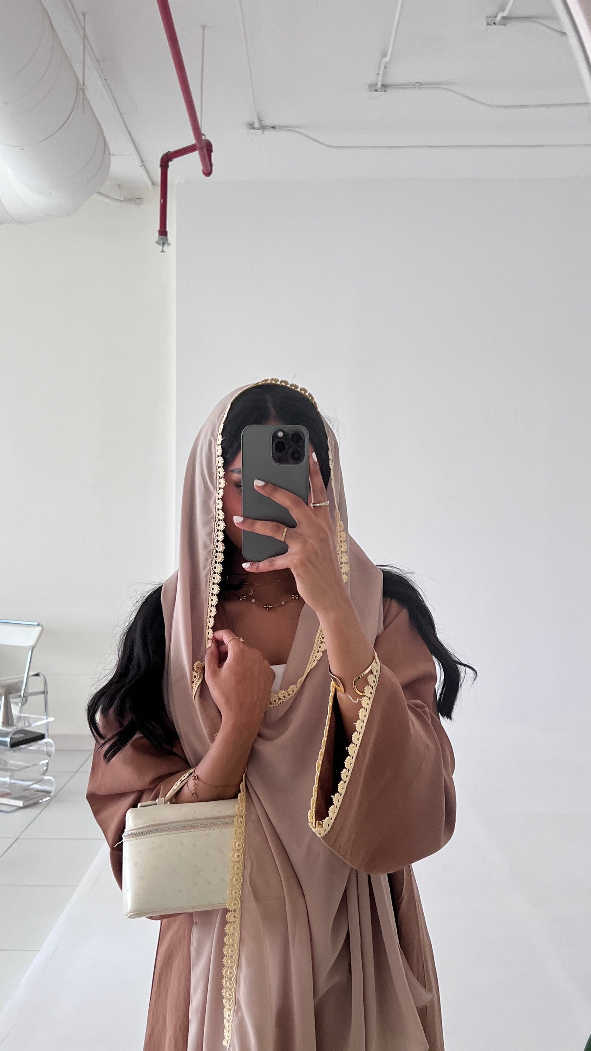 تزين الحواف تفاصيل من الدانتيل الفاخر، التي تضيف لمسة أنثوية أنيقة، بينما يكتمل التصميم بشال متناسق يمنحك خيارات متعددة للتنسيق بأسلوب عصري ومميز.