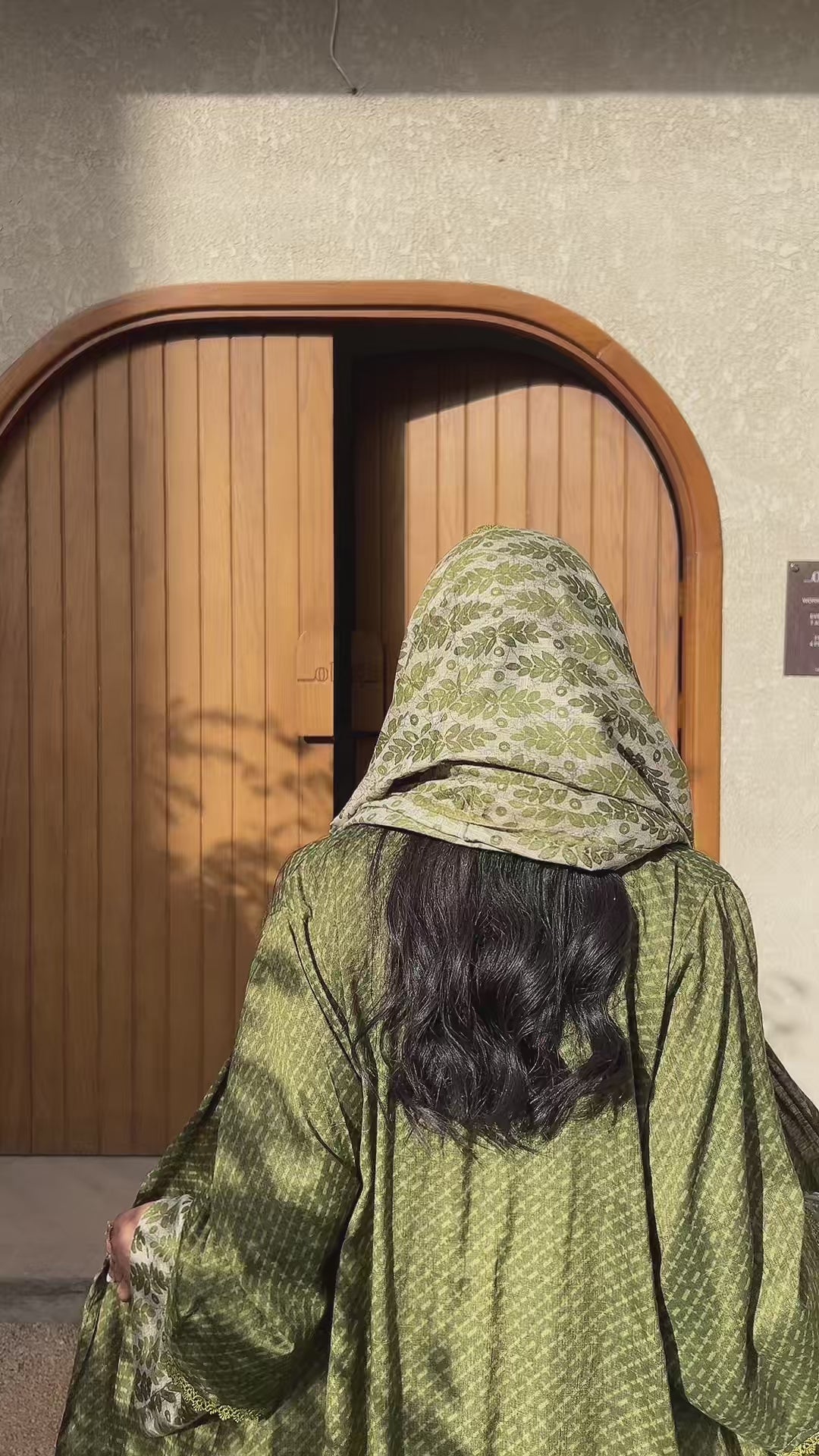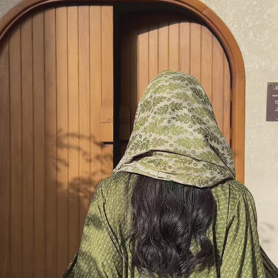 عباية هندية من القطن الخفيف بدرجات الاخضر الزيتوني مع طرحة و أكمام بنقشة بيزلي مع حواف دانتيل